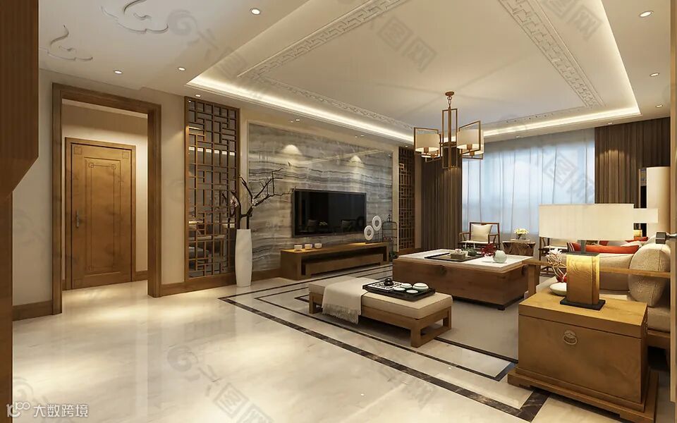 新中式是传统中式与现代审美的相结合,沿袭对称室内布局,塑造高级别的空间通透感,追求整体格调的大气优雅。