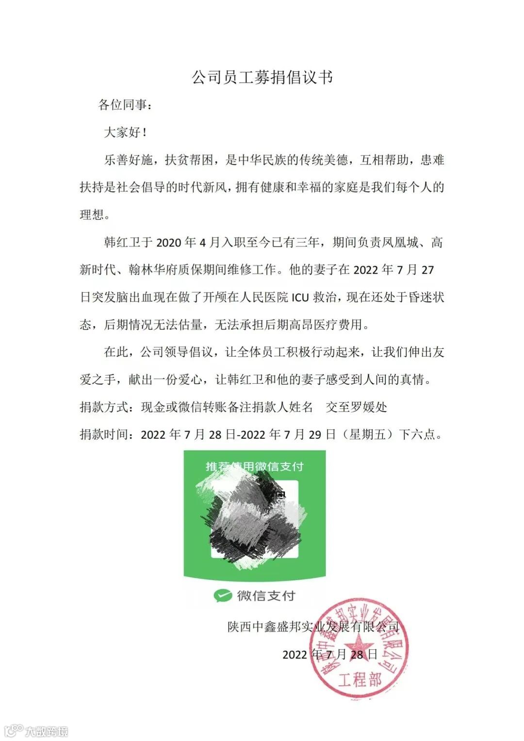 韩红卫于2020年4月入职我公司至今已有三年,他在工作中认真负责,兢兢业业,但天有不测风云,人有旦夕祸福。2022年7月27日他的妻子突发脑出血,经历了一系列的救治,人仍在ICU进行观察,后期康复还需大量治疗费用,对于这样一个普通的家庭,高昂的治疗费,成了压死“骆驼的最后一根稻草”。