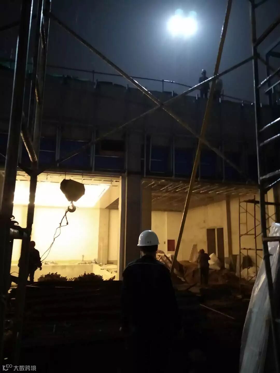 在安全员的指挥下,塔吊也在有条不紊的配合夜间施工。