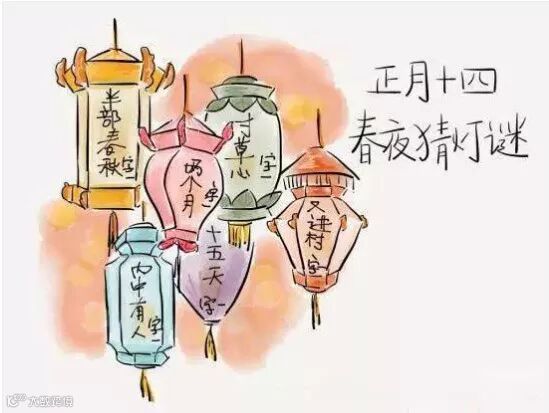 【正月十四】今天是农历正月十四。在中国大部分地区,十四这天所有的事都是为了第二天的元宵节。这天,灯会正是开放供市民购买灯笼。为了元宵节,像舞龙和舞狮的表演开始在大街上演习。也有人写灯谜猜灯谜来增加节日欢乐气氛。在中国,灯谜是非常传统的字谜游戏。大人和孩子都喜爱解决这些问题。