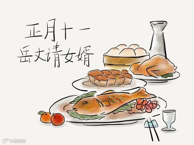【正月十一】民歌中有“十一请子婿”的说法,即正月十一是’‘子婿日“,岳父们在这一天宴请子婿。相传,这是因为初九庆祝”天公生“的食物到初十还吃不完,所以,就在十一这天用来请子婿吃饭,娘家也不必再因此破费了。