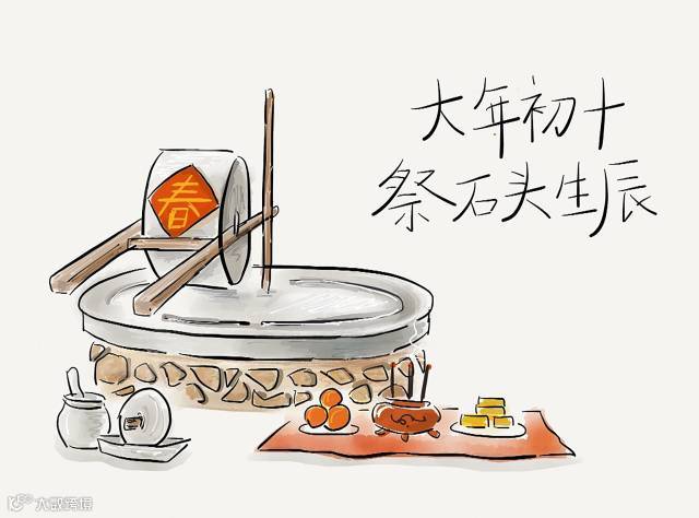 【正月初十】这一天凡磨、碾等石制工具都不能动,甚至设祭享祀石头,恐伤庄稼。也称“石不动”“十不动”。河南风俗这一日家家向石头焚香致敬。午餐必食馍饼,认为吃饼一年之内便会财运亨通。在山东郓城等地有抬石头神之举。初九夜,人们将一瓦罐冻结在一块平滑的大石头上,由十个小伙子或十个小姑娘轮流抬着瓦罐走。石头不落地则预示当年丰收。