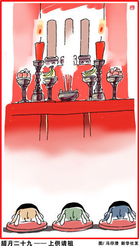 腊月二十九(2月14日),上坟请祖上大供。对于祖先的崇拜,在我国由来已久。