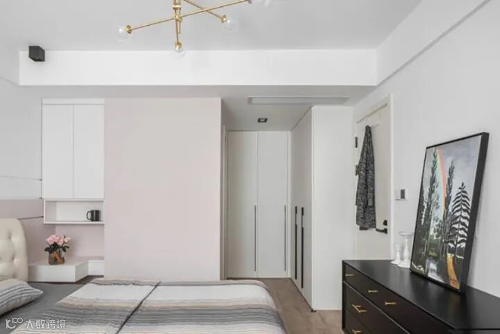 对于卧室空间不大,或者是想要卧室保持统一性的时候,可以选择打造一个顶天立地的衣柜,柜内合理的分区,让衣物在有限的空间内,展现出最大的利用价值,这样的设计不仅增加了收纳空间,而且也减少了后期的卫生死角。
