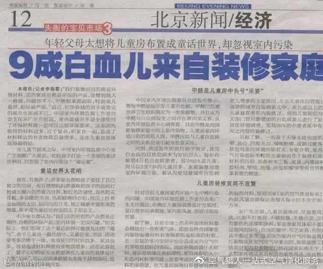 一个成年人每天呼吸大约2万多次,吸入空气达15~20m³。儿童的呼吸量是成人的两倍,加上儿童身体功能发育不完善,抵抗力较低,因此更容易受甲醛的影响。根据中央电视台2017年的报道,北京儿童医院90%的白血病患儿家中半年内做过装修。
