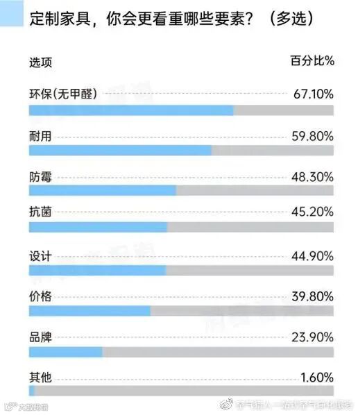 《2021中国家居消费趋势观察消费者报道调研报告》显示,1200名消费者对“定制家具,看重哪些要素”进行投票,其中“环保(无甲醛)”是消费者最看重的,达67.1%。