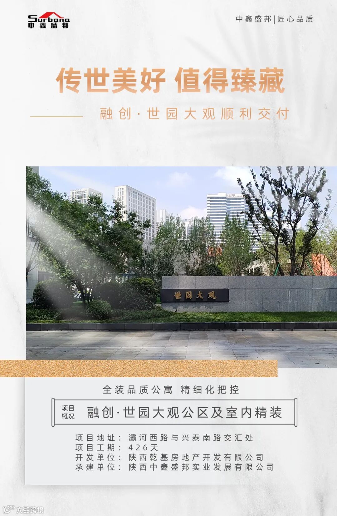 盛夏来临,生机蓬勃,家期已至君归来!5月30日,中鑫盛邦承建的室内及公区精装修品质项目——融创·世园大观不负芳华,在双方的共同努力下,于初夏时正式盛大交付。淬炼时光的雕琢与打磨,以匠心品质凝结恢弘实景,为业主呈上一座理想的家园大观。