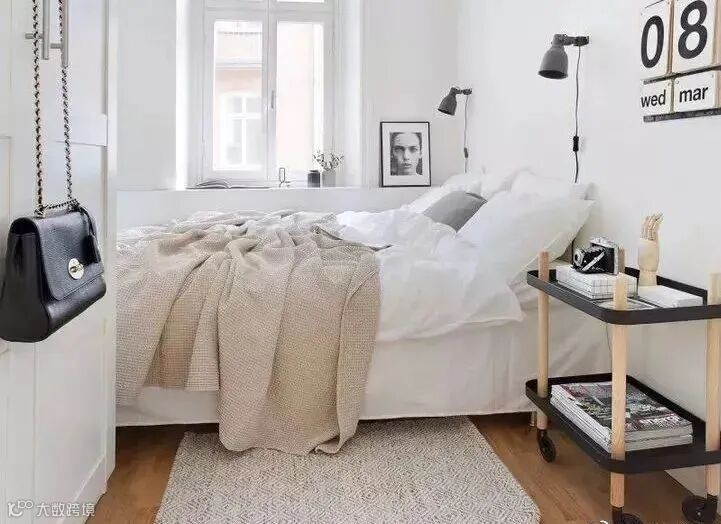 很多床头柜体积大,造型方方正正,笨重又没有新意,若在床两边都摆上床头柜,有点浪费空间。