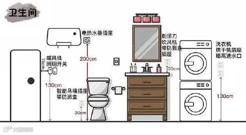 卫生间是湿气、潮气比较重的地方,因此要做好安全措施,安装防溅罩插座。插座安装高度要在1.5-1.6m,防止被水溅到或者受潮,导致漏电。