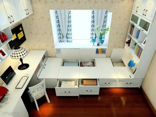 增大飘窗下面镂空做成抽屉可以更好的收纳,并且闲暇时可以躺在上面休息,给孩子做成玩耍的地方也很不错,旁边做一个书桌孩子可以写作业,或者做成梳妆台也很不错。