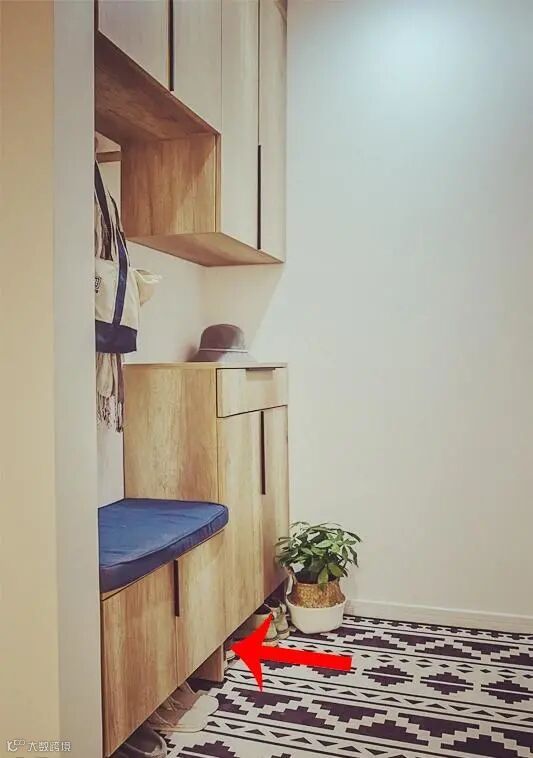进门处定制一个鞋柜,预留换鞋的位置,可以坐在凳子上换鞋,另外鞋柜的最底部预留了一些空间出来,放一些常更换的鞋子,这样更方便实用。