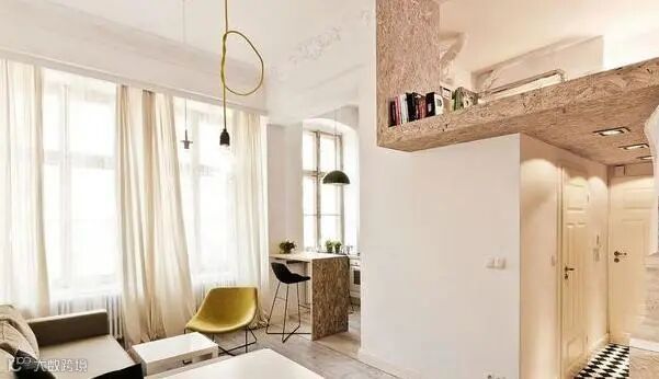 此案例的空间高度比较高,加上大面积的落地窗,在视觉上给人的感觉更开敞宽阔些。整个空间通过采用各种软性分割的设计来区分不同的功能空间,利用厨房卫生间较低高度在上面搭建一个休闲读书区。