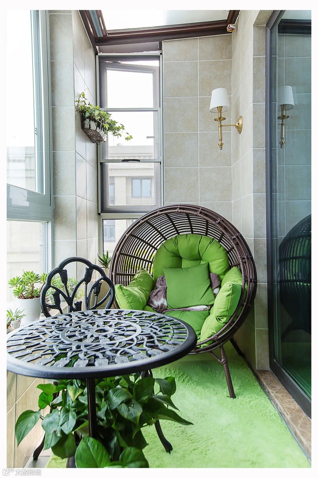 阳台打造休闲室也是轻轻松松的事,黑色休闲桌搭配圆形舒适躺椅,铺上绿色地毯,窗台再放置几盆绿植,整个空间生机盎然。加以壁灯照明,通透又明亮。