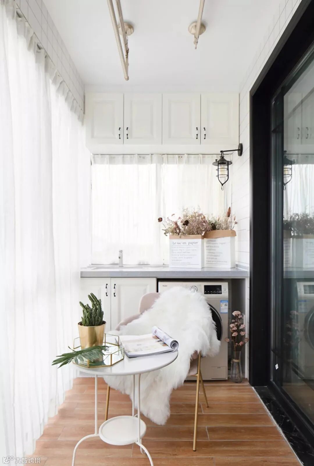 阳台一侧安装了洗漱台,下方放置滚筒洗衣机,上方的白色吊柜具有收纳功能,空间利用十分合理。另一侧是休闲桌椅,午后品一杯下午茶、随意翻看几页杂志,真是舒适又惬意!该款阳台在设计上集实用与休闲为一体,可以说是家家户户都很适用了!不过,阳台改造一定要注意,地漏与排水时注意,洗衣机排水量比较大,下水管尽量不要直来直去很容易引起地漏反水。如果阳台空足够的话,可以采用用砖砌,如果是现场打或者定制的话,一定要做好柜体的防潮措施,一般柜体贴上防潮纸,这点一定要注意了!