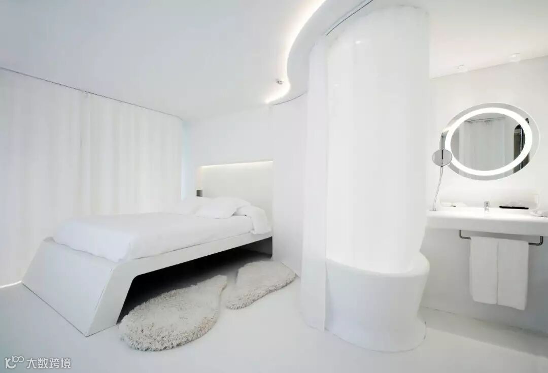 在客房内部,床、桌子和其他家具都是从同一片人造石上延伸而出,造型圆润光滑,好像客人只需一个指令就能让它们自动收回到墙壁里去。