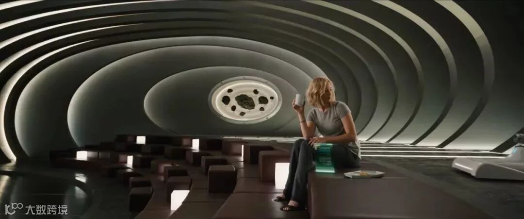 例如飞船里充满曲线感的大剧院,所有的曲线将视线引向陨石,使飞船内部与外部产生联系。