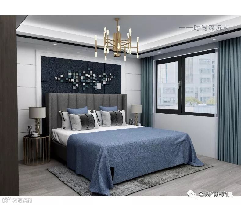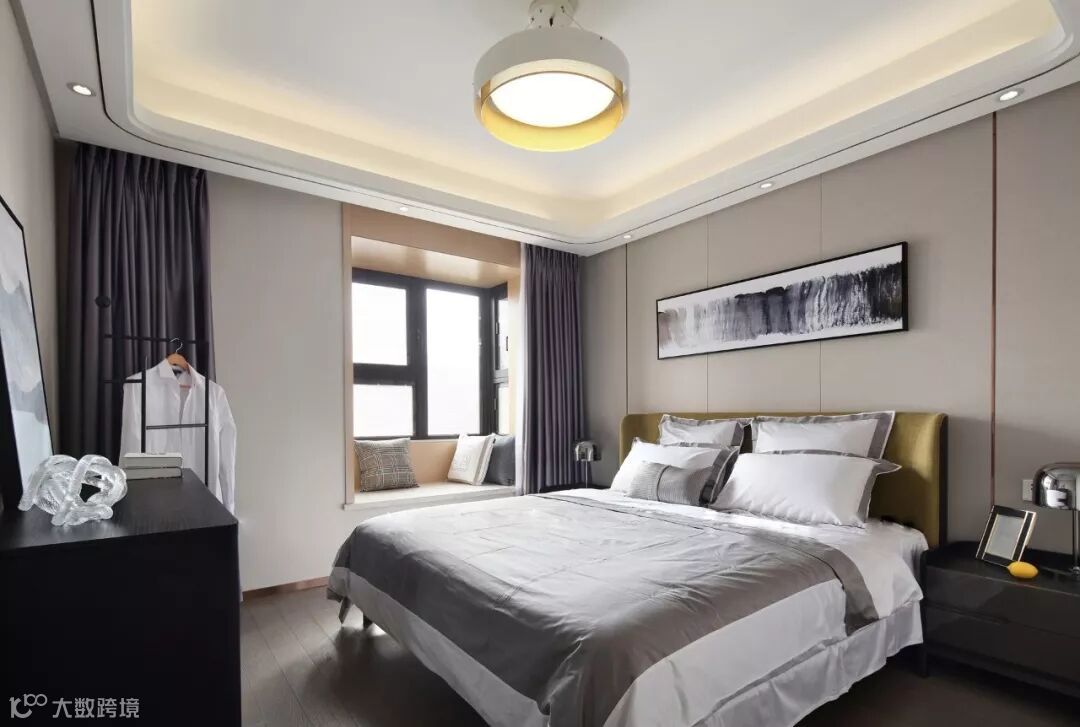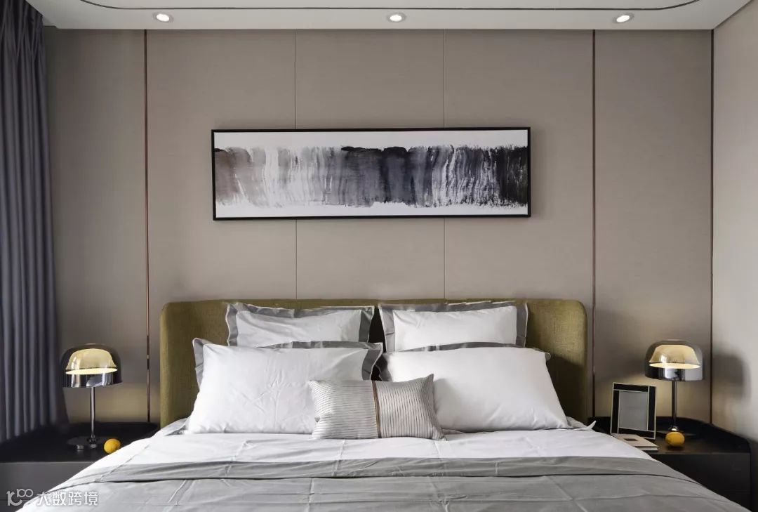 在以灰色调为主的卧室里配上橄榄绿的大床,可以缓解空间的单调乏味,同时提升质感,在清新之余还让人感觉到暖意,宁静的气氛很助眠,也让人惊叹高级。床头上的装饰画名叫“晕染”,寥寥数笔丹青染在白宣之上,给空间带来简逸恬淡的意境。