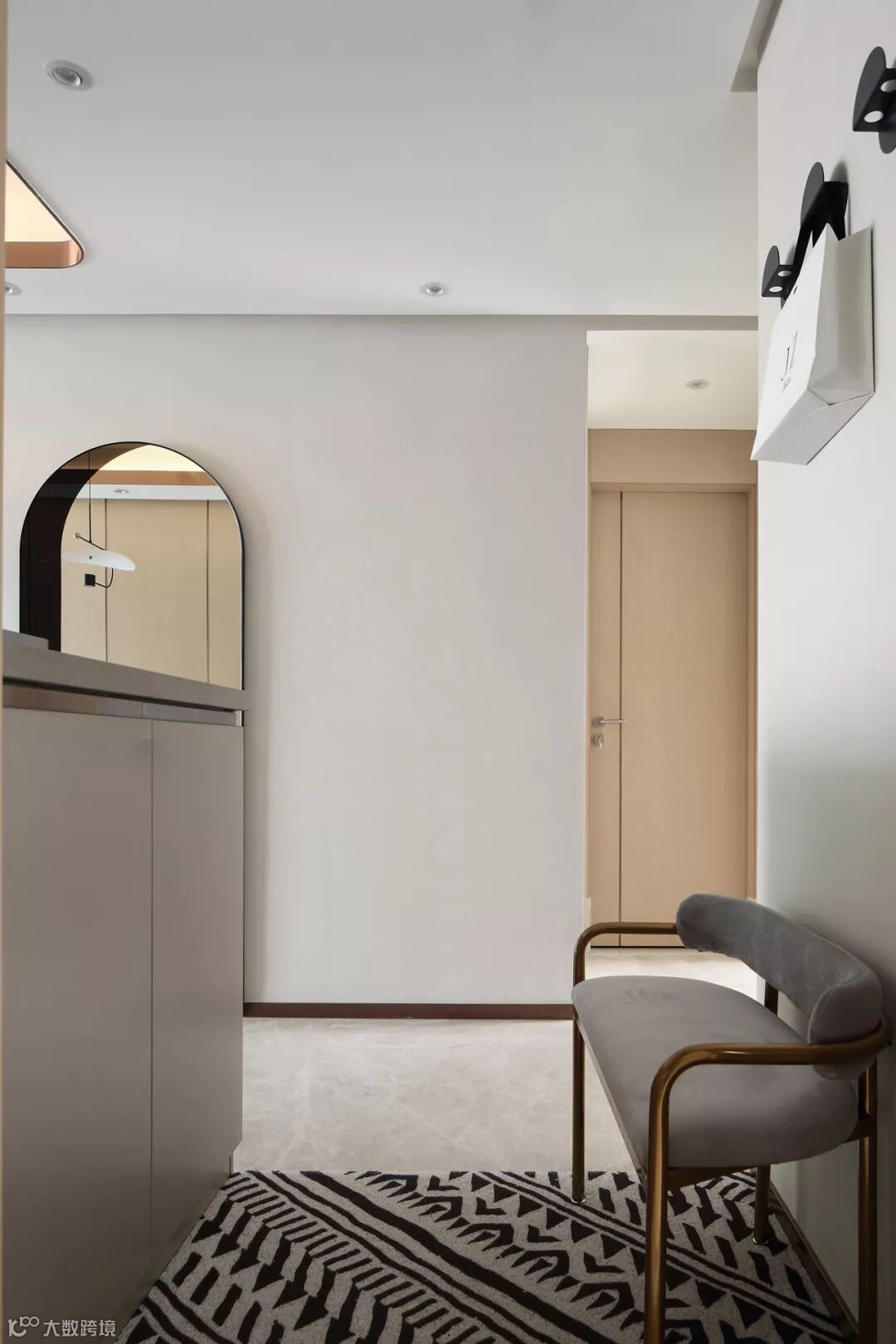 进门的玄关左手边是定制的鞋柜,灰色柜体搭配同色系石材台面,含蓄低调,充满时尚感。地面灰色花纹地垫搭配金色腿换鞋凳,方便我们出行的同时又散发出了摩登气息。右边墙上安装了3枚简约多功能的蓝灰色挂钩,像小猪一样可爱萌趣,很好的融入墙壁又方便我们随手挂包及小物。墙上铺贴了灰色的墙布,使整体家居在色彩上柔和稳重、和谐统一。