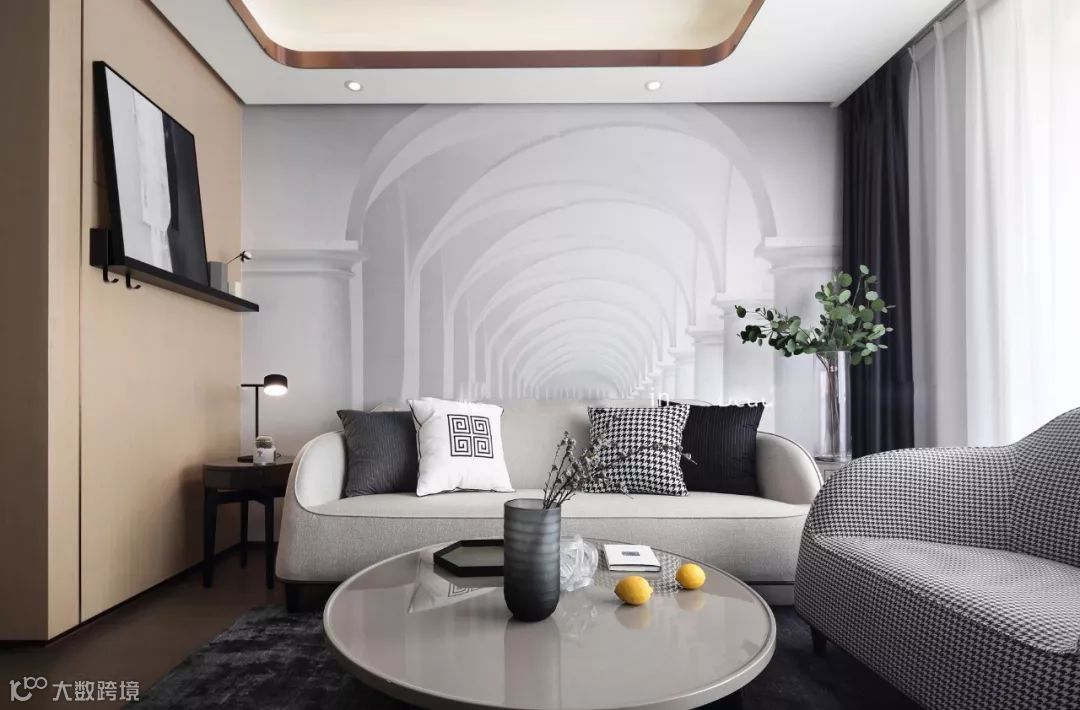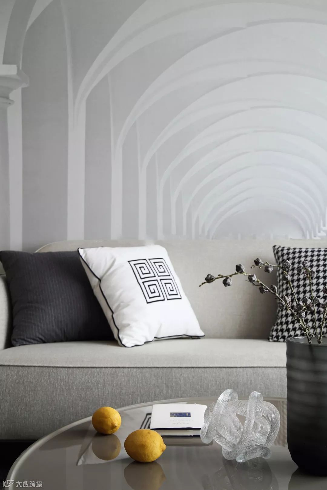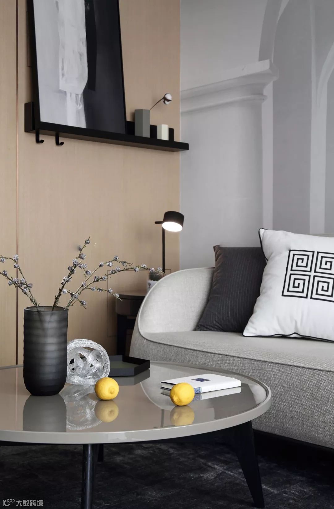 茶几上横纹渐变灰的花瓶与不规则水晶摆件,放在一起显得很有气质,高低落差之间使得空间更有层次感。