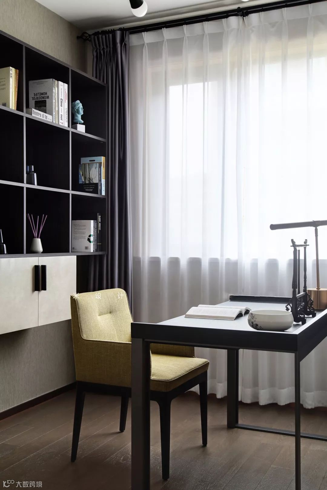 书房墙上的书架是根据整屋色系定制的,黑色的书桌现代却不生硬,房间内营造的氛围可以让屋主静下心来看看书、写写毛笔字,惬意、舒心。