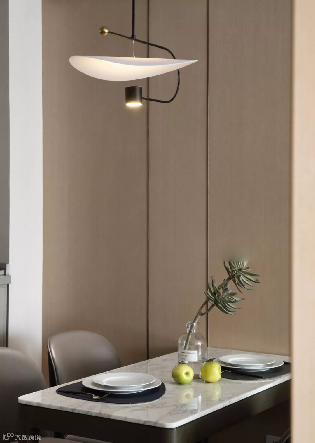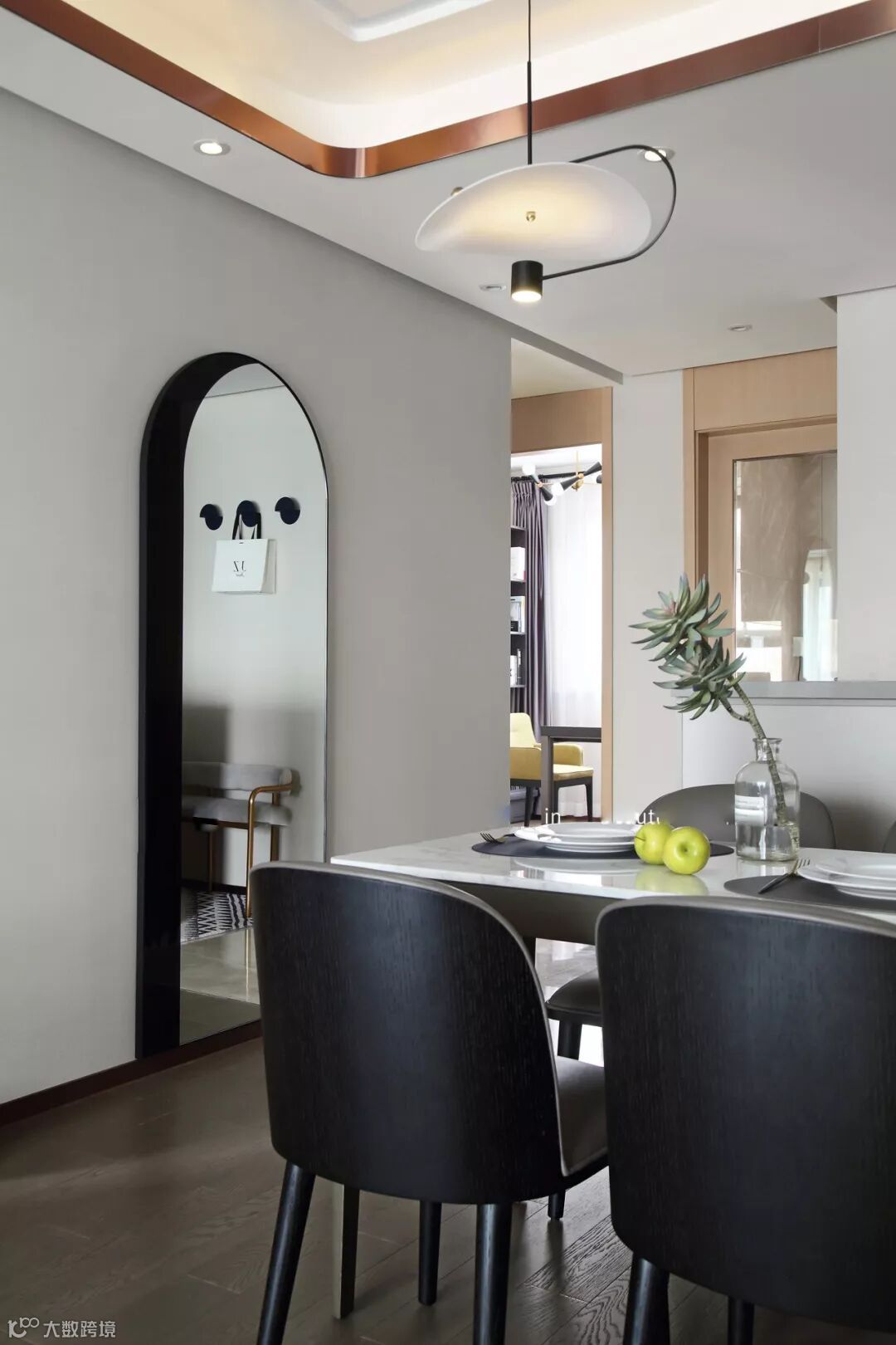 餐厅的吊灯精致小巧,造型独特,黑白金的搭配增加了空间的时髦感。