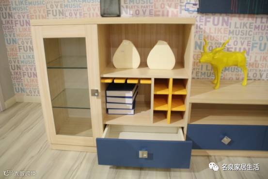 首先我们先从酒柜开始看起。在颜色上,采用了蓝、黄两种颜色点缀,这个也是枫彩系列的主要颜色。(我深深地觉得设计人员是不是对枫叶的颜色有什么误解)