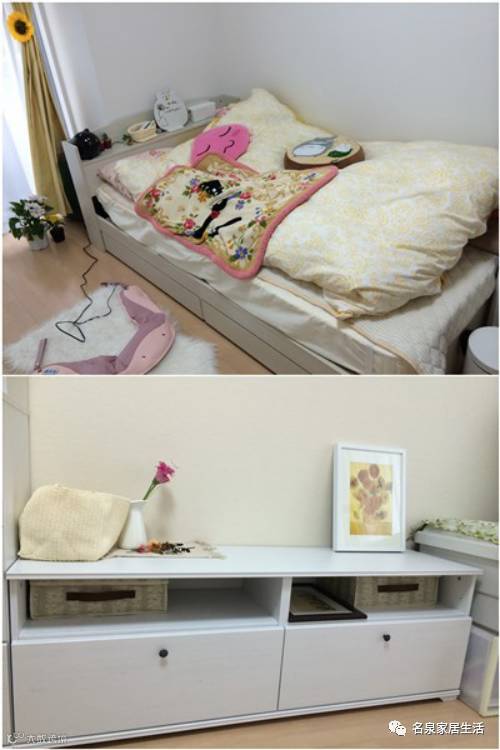 8.首先,一定要选带柜子的床,这样床头柜,以及本身床体所带的空间可以容纳很多的衣物。我一般会选择把不是当季穿的衣服放到床体自带的柜子里去,这样,只需要按季节整理衣物就可以了。