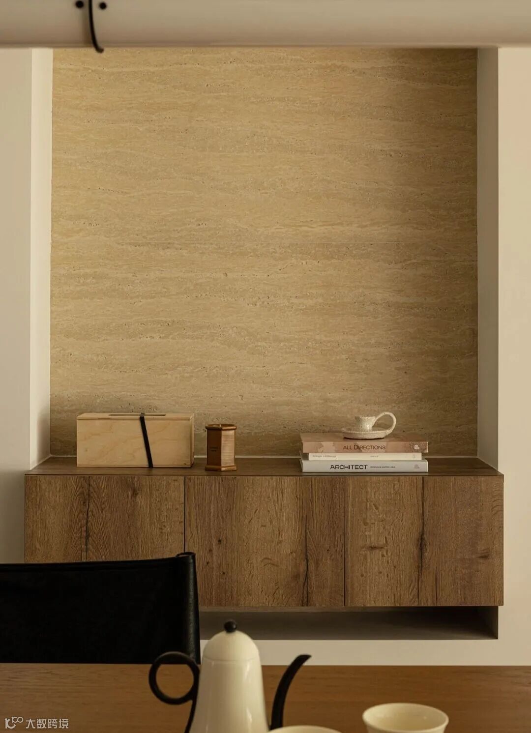 ▲ 餐边储物、洞石、墙体结合形成的体块关系