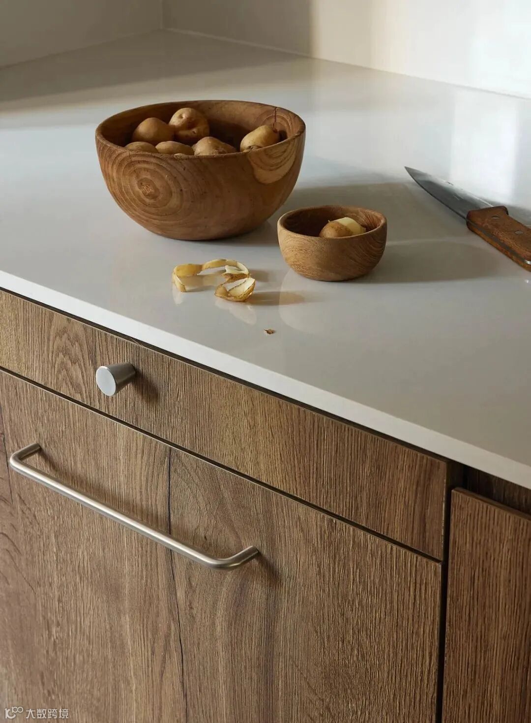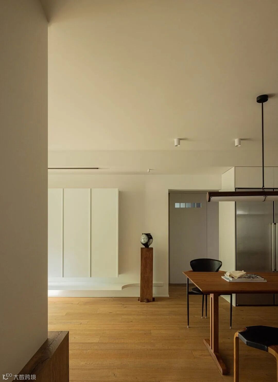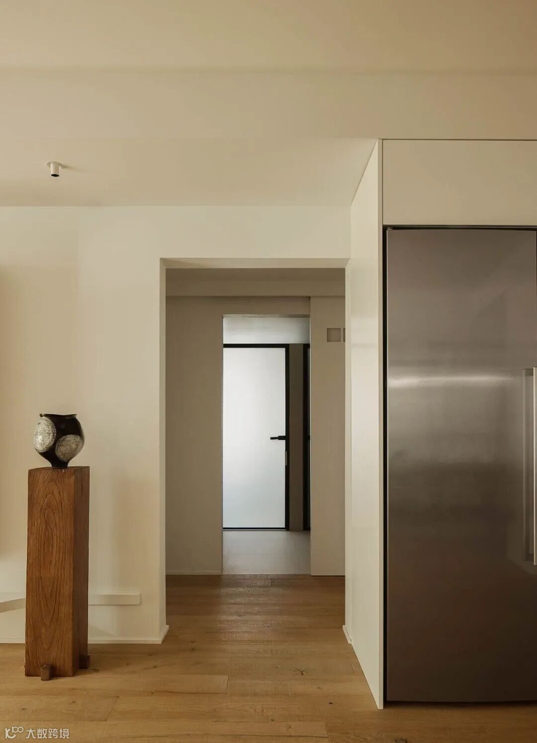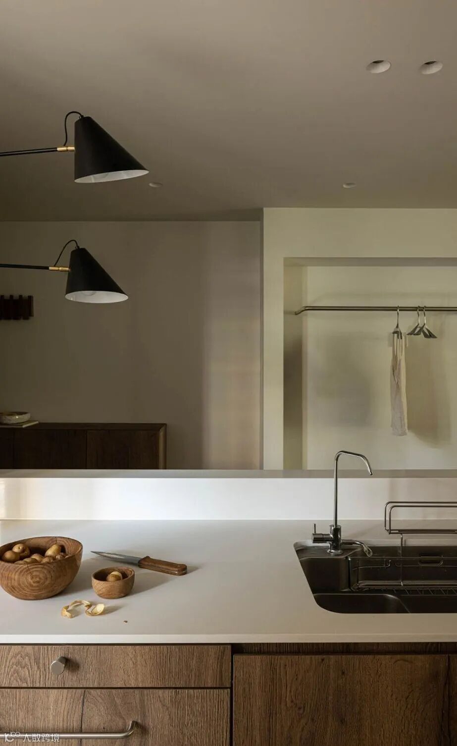 ▲ 入门玄关区域,由厨房操作区与右侧收纳功能区围合成的过道空间,光线透过厨房投射到空间,打破了过道的昏暗和狭长,加深的操作台内部做了划分,柜门可面向过道开启,增加了多种储物的可能性
