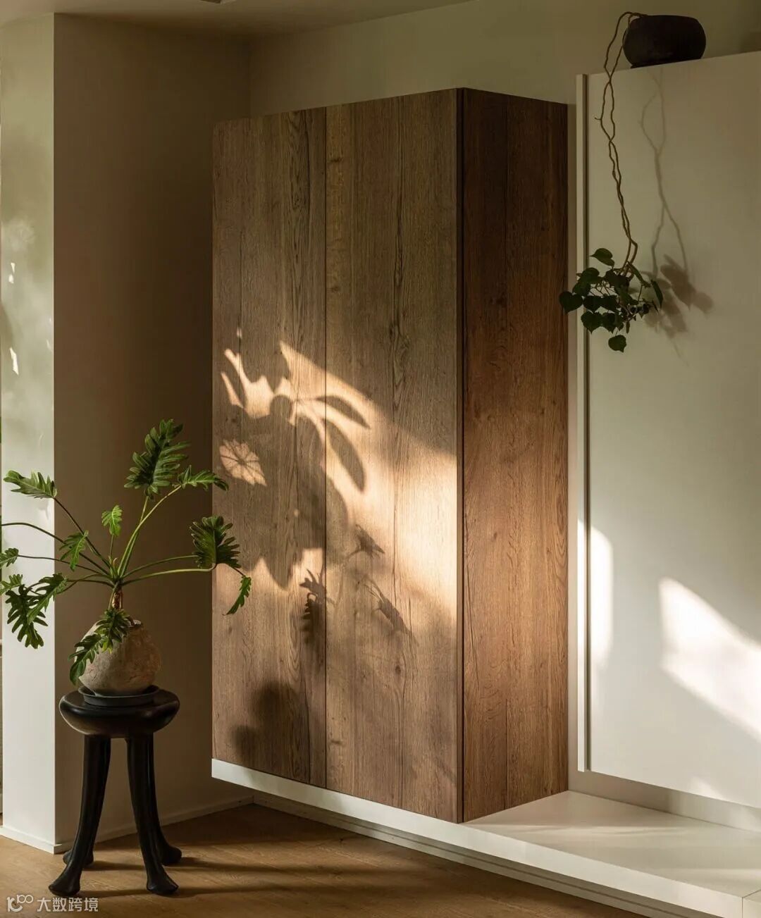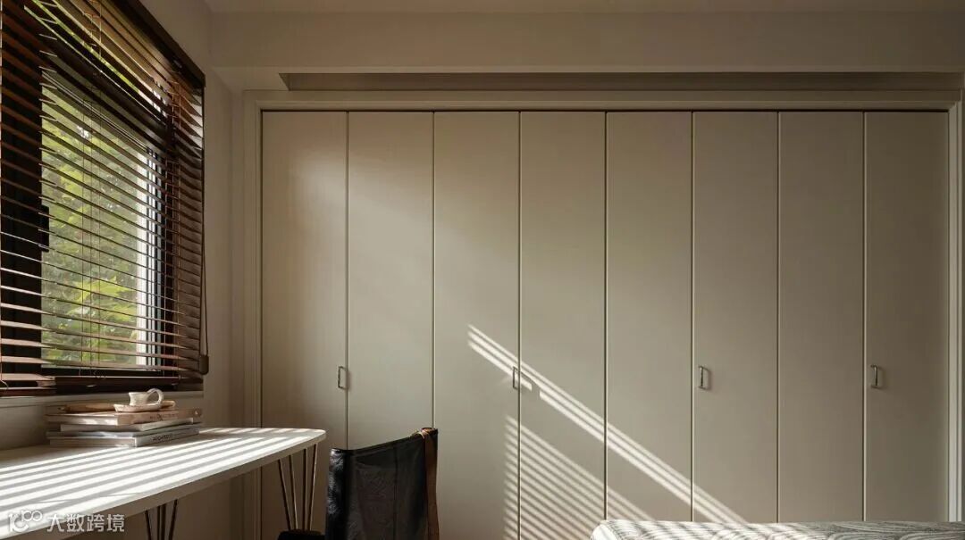 ▲ 阳光透过百叶过滤到室内,犹如给空间披了一层滤镜,折叠柜门和金属挂架组合的衣柜,可以容量大量衣物