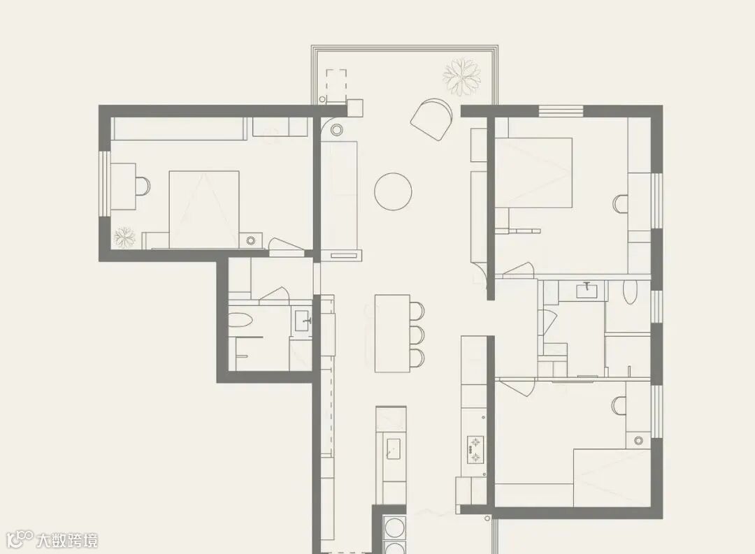 ▲ 整个空间以浅色的墙面和带有岁月肌理的地板为基底,大面玻璃窗映入室外郁郁葱葱的绿意,与室内的绿植相呼应,构建出难能可贵的亲切感,散发出从容平静的氛围
