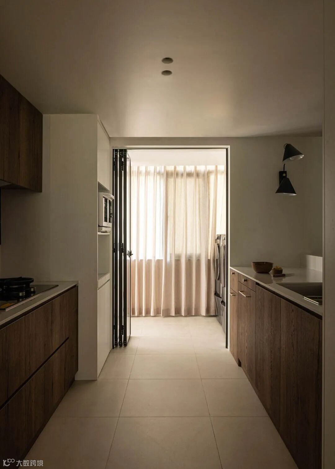 ▲ 厨房亦采用木色调和自然纹理,与餐客厅之间无缝连接,折叠门后是生活阳台