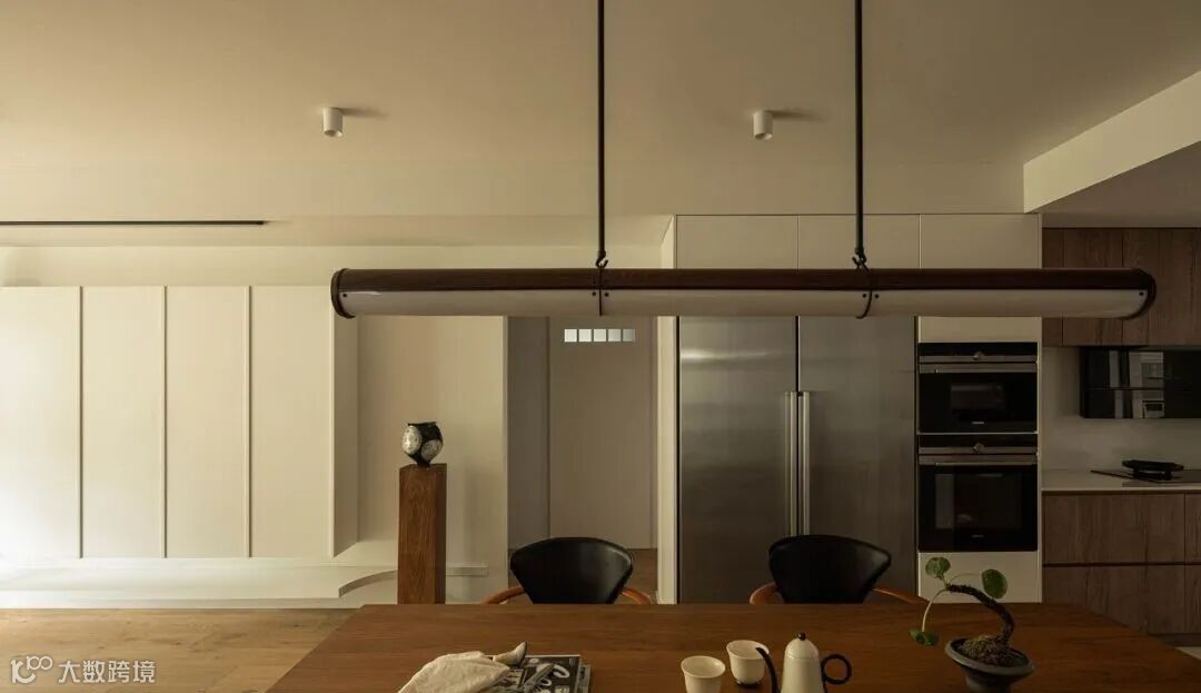▲ 餐厅,中古风的餐桌椅和吊灯结合,颜值与实用性并存,背景打造高柜嵌入厨电