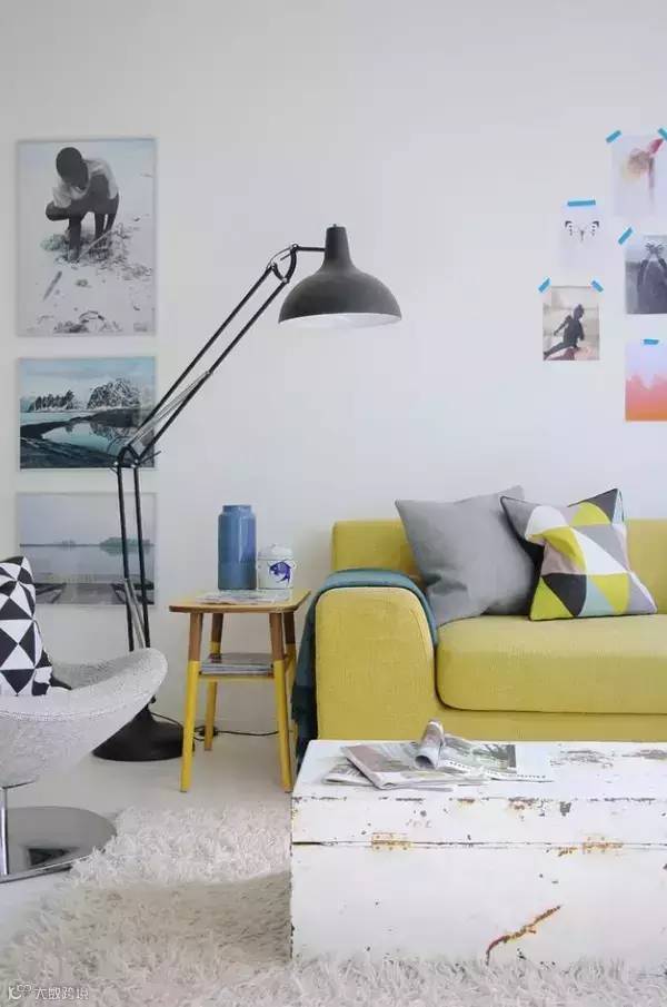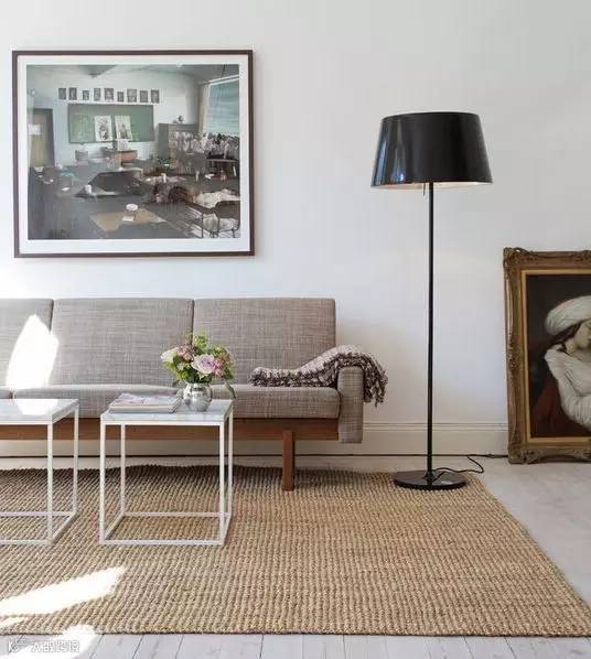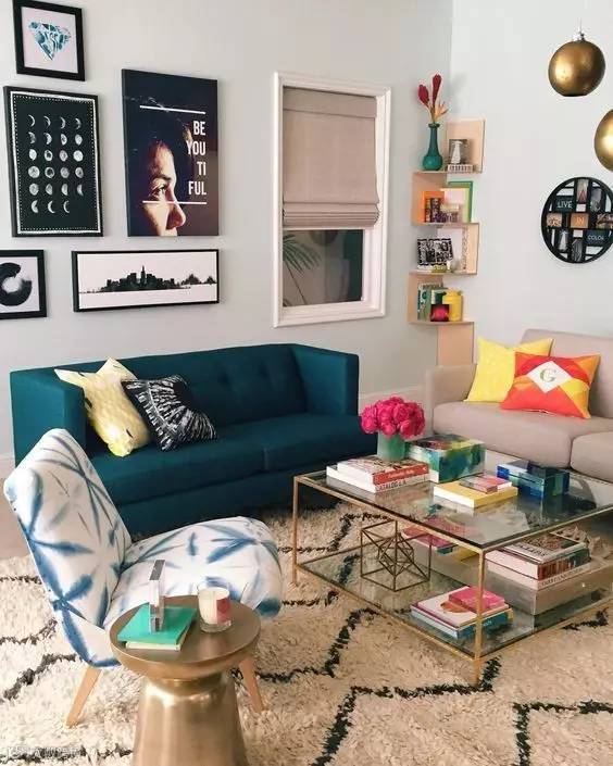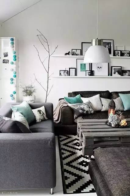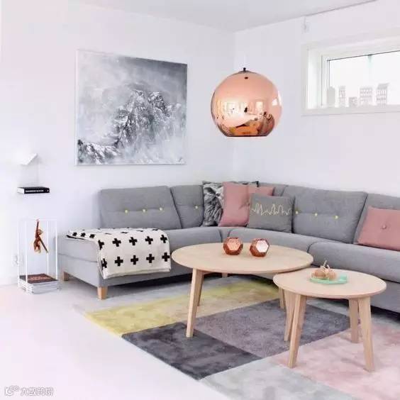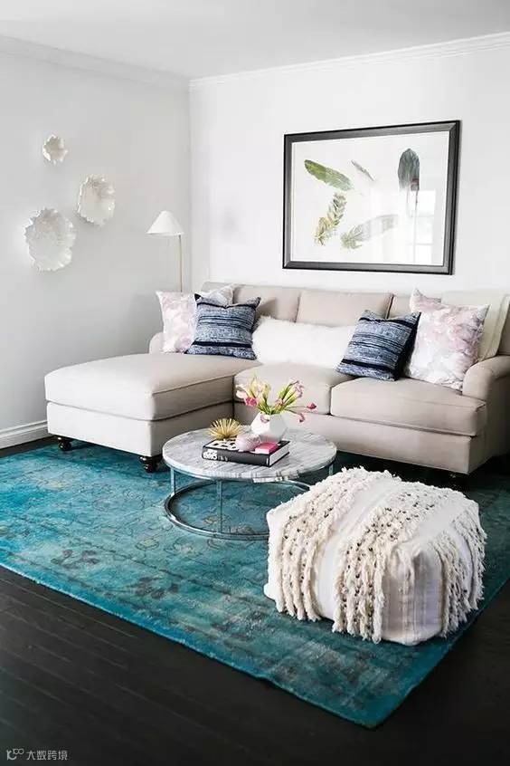 2.如果靠垫和沙发撞色,地毯要紧随沙发的颜色来保持主流。地毯的颜色最好比沙发浅一些,这样凸显层次感又可以避免头重脚轻。