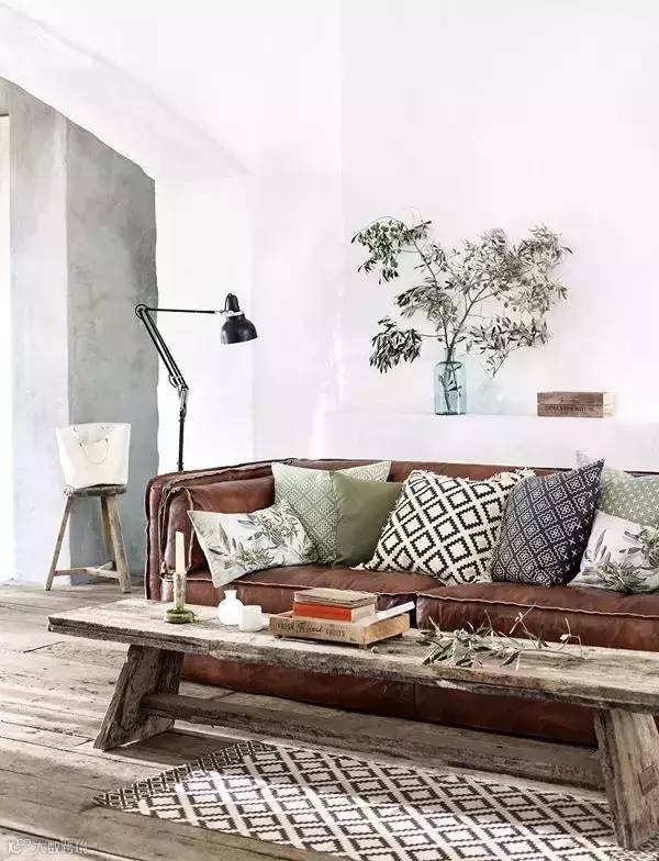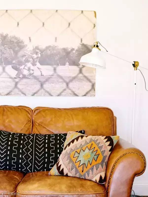 老式的皮沙发可以选用几何条纹靠垫