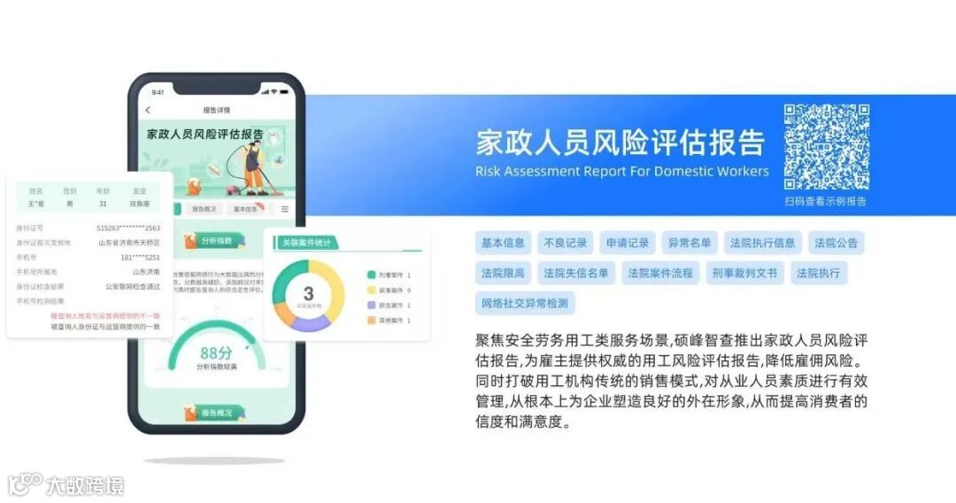 硕峰智查不只是一款风险评估工具,更是家政公司的“安全合作伙伴”——用权威数据破解风险难题,用高效服务降低运营成本,用合规技术保障经营安全,让每一份家政服务都有专业评估护航,让雇主安心、企业省心!