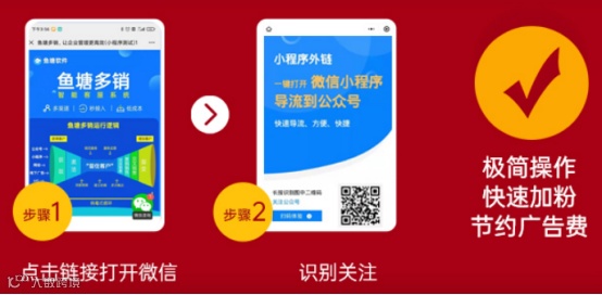 我们这里说的跳转能力是指满足从站外任何平台的场景下,点击即可跳转到微信的一种能力。鱼塘加粉宝就能具备这种跳转能力,是一款应用非常广泛的企业私域引流工具,能实现头条、抖音、百度、VIVO、知乎、快手、浏览器等平台、直播间一键跳转微信快速加粉、加好友,实现从微信站外引流加粉、助力企业更好地私域运营!