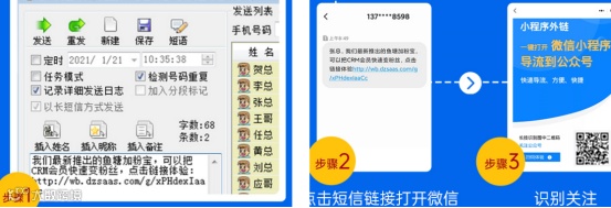 通过“鱼塘加粉宝+短信群发”的方式,给CRM系统里的客户群发一遍短信,仅仅只需“点击链接打开微信-识别关注加好友”两步,就能快速把企业CRM系统的客户,变成微信粉丝,加粉效率提升300%,还能大大提高复购和转化。