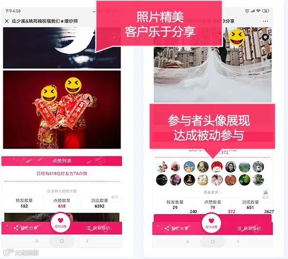 图片集赞是目前商家最喜欢的吸粉方式之一,通过鱼塘图片集赞功能,企业可以快速策划裂变吸粉活动,鼓励老客户将自己的美照(如婚纱照等)分享发送到微信朋友圈、亲朋好友群等,邀请好友来点赞,客户所获得的点赞数越多,能够获得的礼品价格就越高。同时,企业可以提前设置点赞前需要关注公众号,这样就很容易快速吸一波粉。