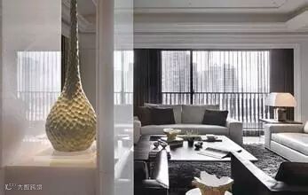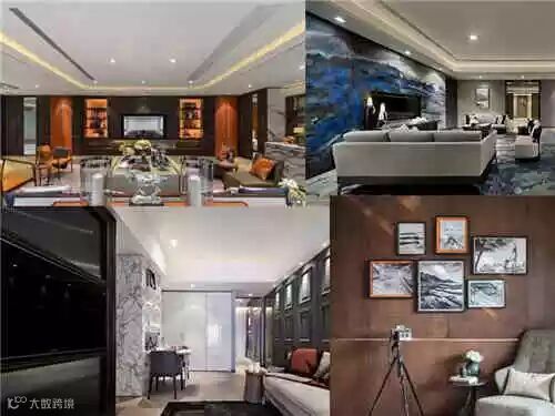 1、有节制的为空间选择两种主色调,黑白就是很好的选择,加入一些黄·色,温暖、奢华感就出来了,加入绿色又会显得很生机。同样色彩采用不同材质演绎,比如说作品中的黑白云纹大理石、地毯,来增加变化感。