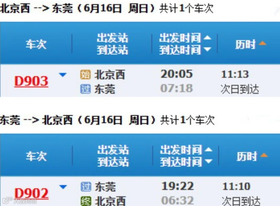 △6月16日东莞站往返北京西站的列车时刻表
