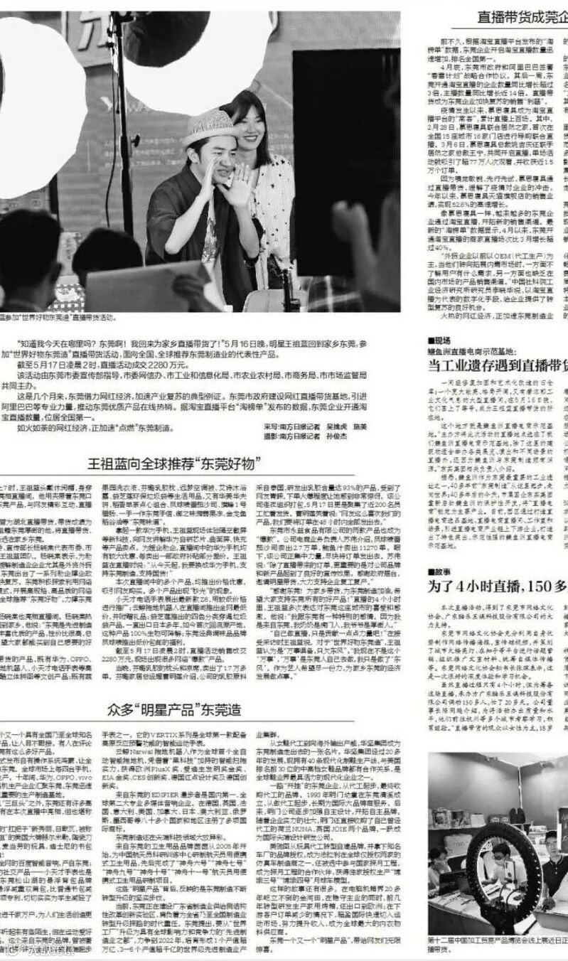 4月底,东莞市政府和阿里巴巴签署“春雷计划”战略合作协议。其后一周,东莞开通淘宝直播的企业数量同比增长超过3倍,主播数量同比增长近14倍。直播带货成为东莞企业加快复苏的销售“利器”。