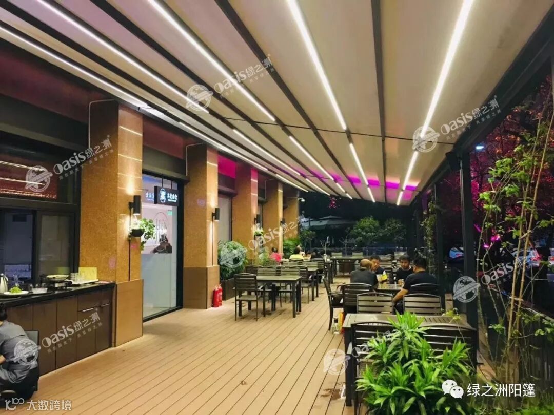 此产品适用于餐厅、酒店、庭院、停车场等诸多场所。以此加大您的营业、休闲、娱乐空间等等。不明显,却给人眼前一亮,对你的户外区域绝对是一个有吸引力的补充。时髦的简易主义智能休闲空间,简洁的铝合金框架支撑,配备一套抗风防雨、遮阳、防晒的顶面电动遮阳系统。非违建,可拆卸,方便搬迁,性价比极高,深爱喜爱!
