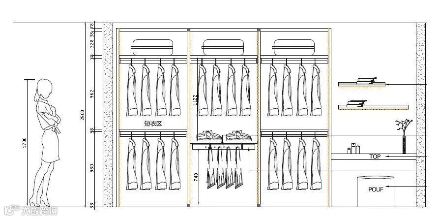 悬挂区一般分成长衣区和短衣区,对于衣服繁多,工作繁忙的现代人士来说,建议尽量将衣物悬挂起来,相比叠放的方式,既容易寻找又保持衣物的自然平整,且容易激发搭配的灵感。