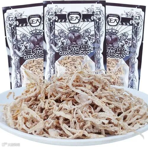 半透明白色小塑料袋,里面装着白丝状的果肉条,吃起来酸酸甜甜,一毛钱一袋。小时候真的以为是无花果,直到有一天看了配料表,上面写着:萝卜丝……
