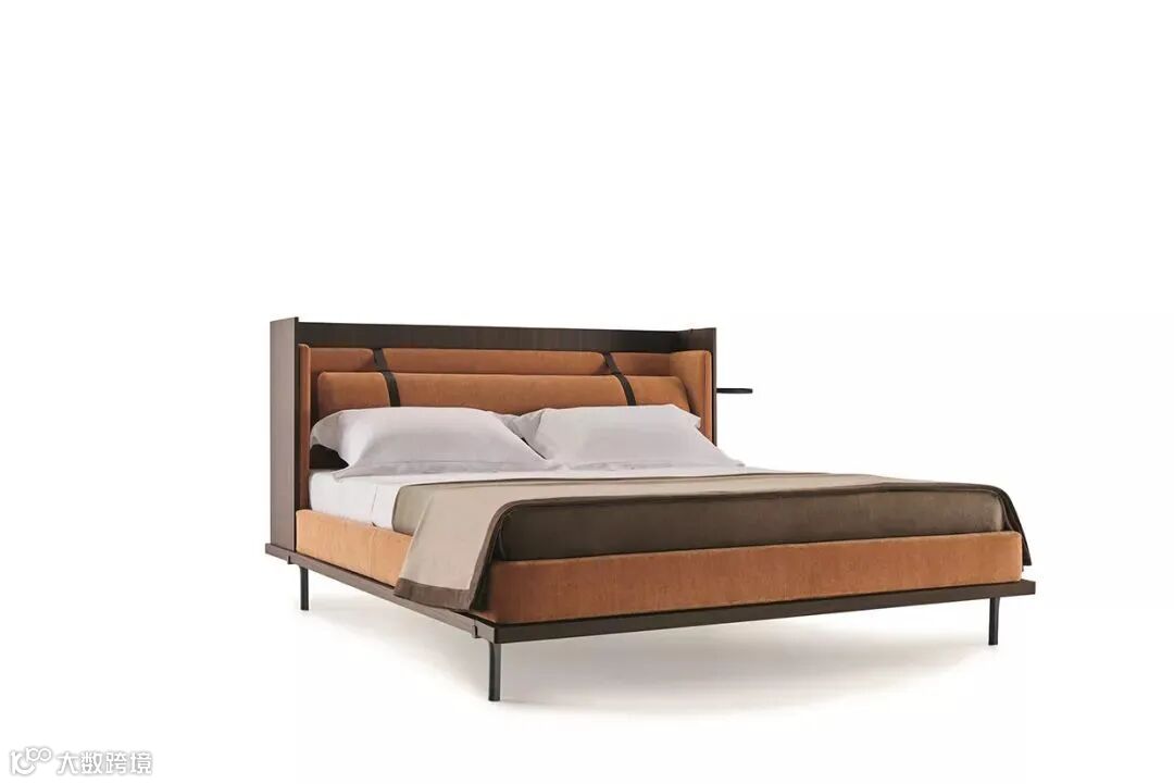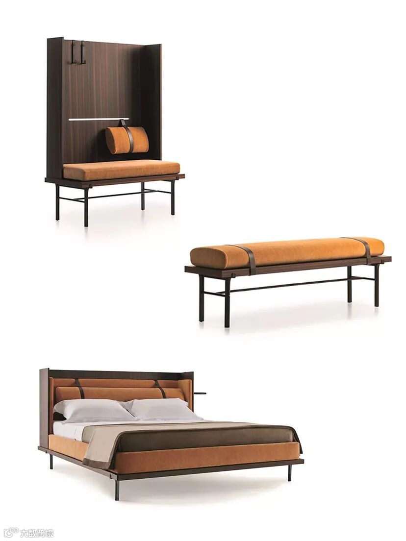 大床的床面为木制,下面由四个纤细的金属支腿支撑,床面的凹槽软包皮革或针织面料,可容纳各种类型的床垫。一张舒适的长凳沿用了大床的设计,可以放在床尾,软垫像大床一样通过皮带固定。