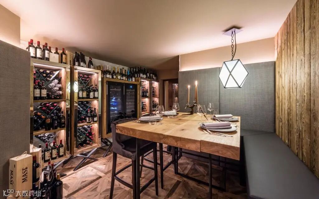 Montchalet酒吧的设计思路沿袭高山风格,大窗户俯瞰着酒店内部花园和游泳池,在一方静谧舒适中注入现代的时尚与热情。酒吧以琳琅满目的酒瓶架为背景,邀请每一位顾客交流谈心,一杯清酒,一段往事,共享静谧舒适的夜晚。