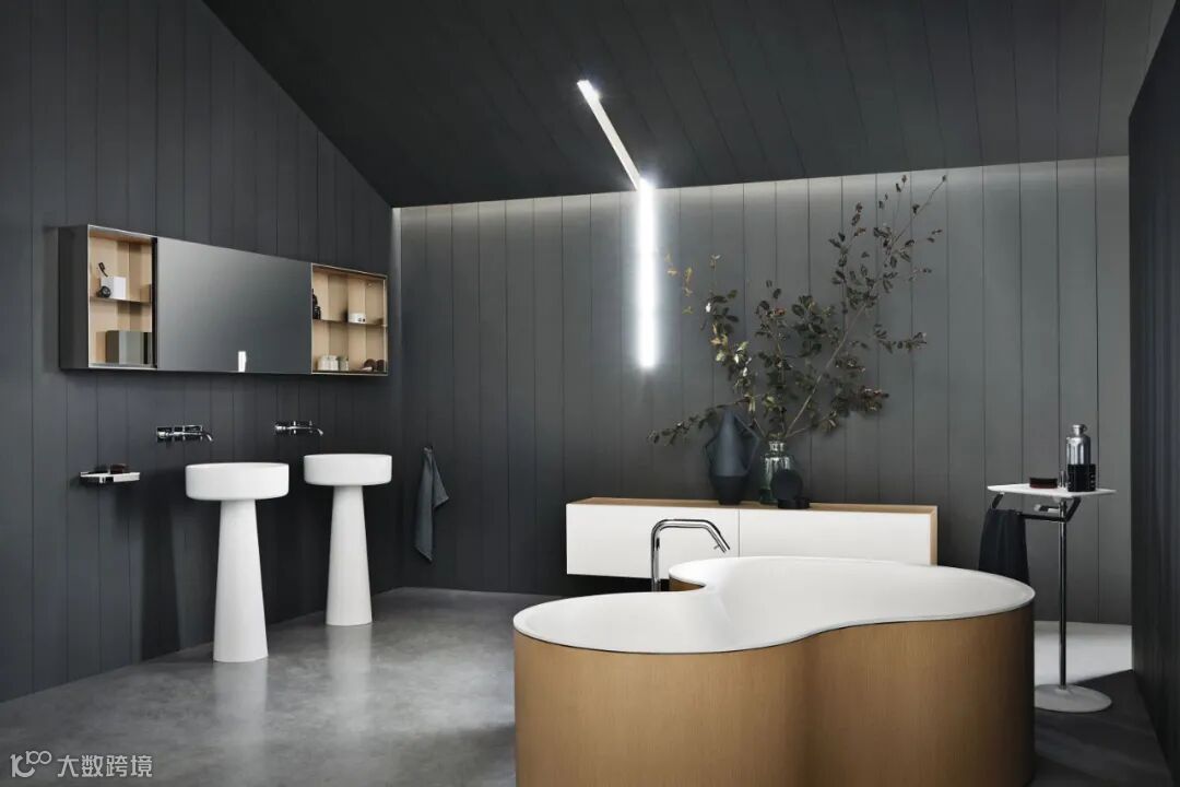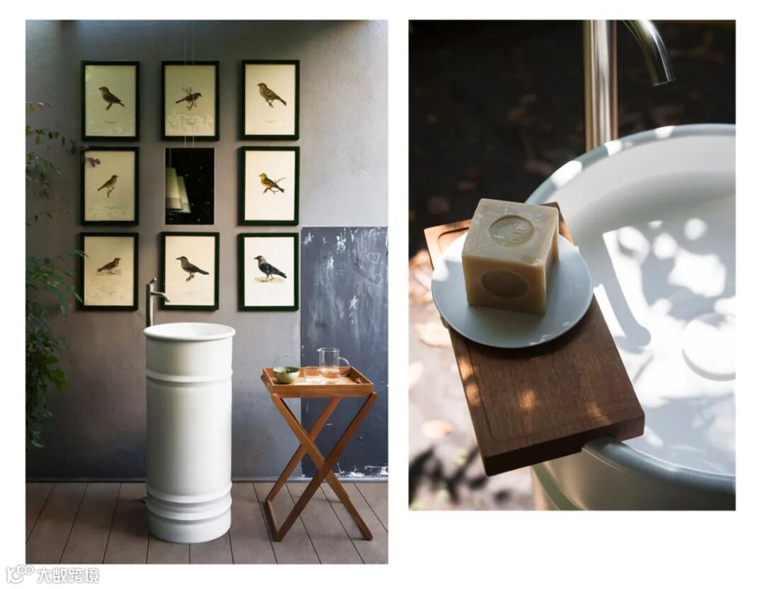 清澈的水流流淌在浴缸及状似油桶的立柱盆下