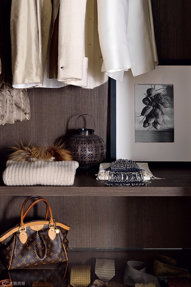 实木贴面的运用,大气沉稳、低调醇厚,既呈现了精细的木纹和肌理质感,又延续了户主独特的情怀,传统材质和现代风格相互碰撞,将优雅奢华发挥到了极致,赋予了衣帽间更多的可读性。