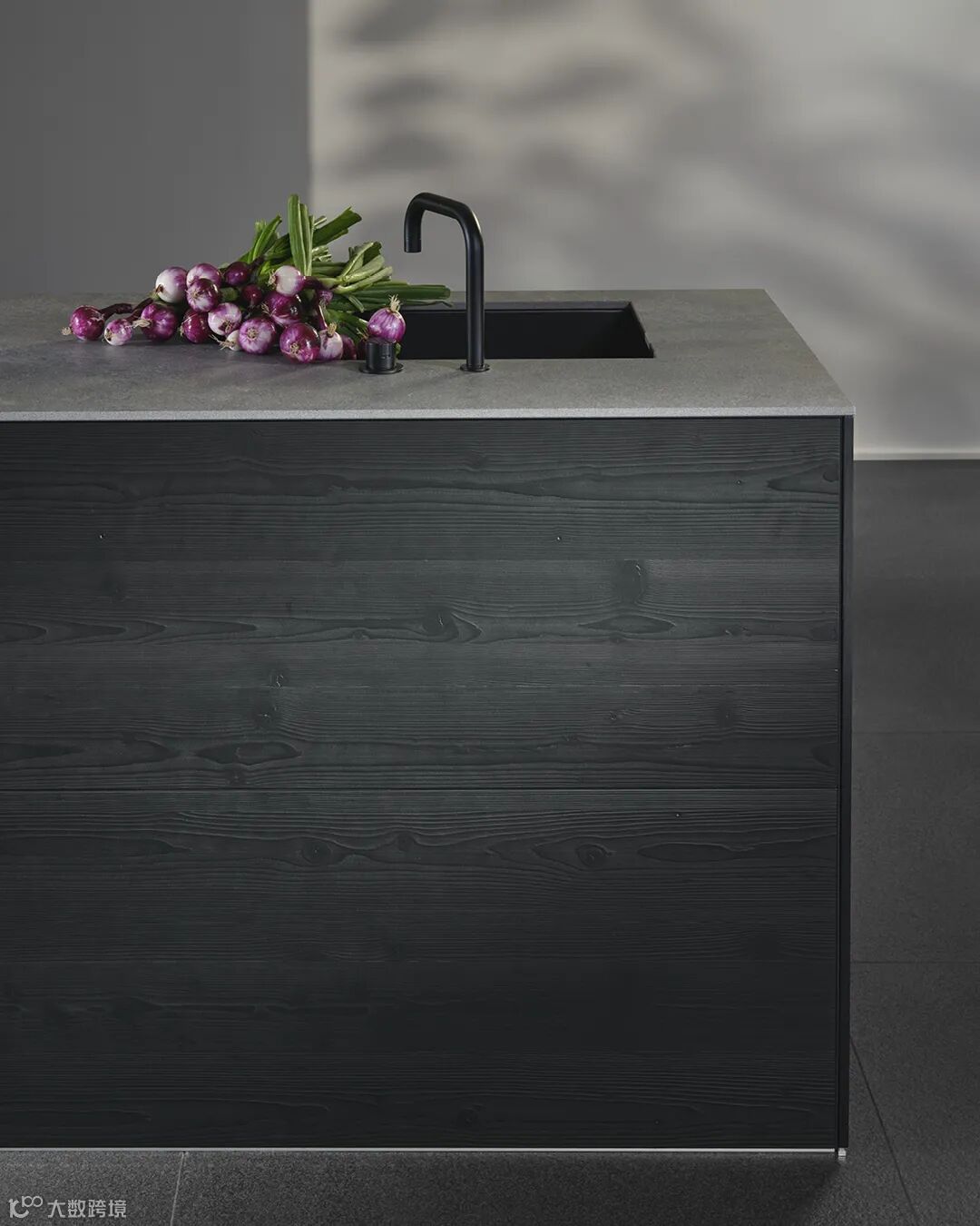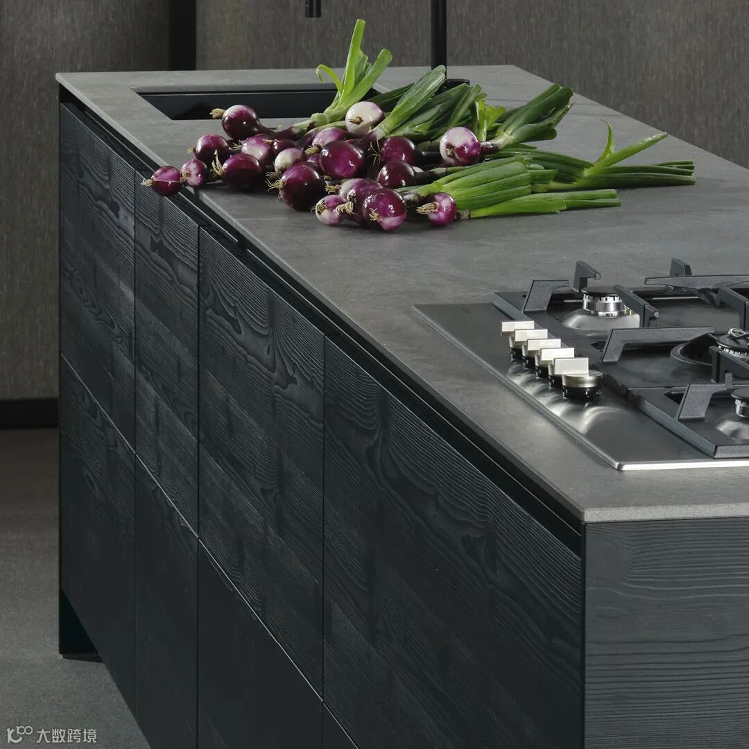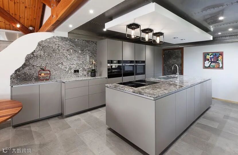 ▪ 卵石灰色烤漆面板,搭配深灰色大理石台面